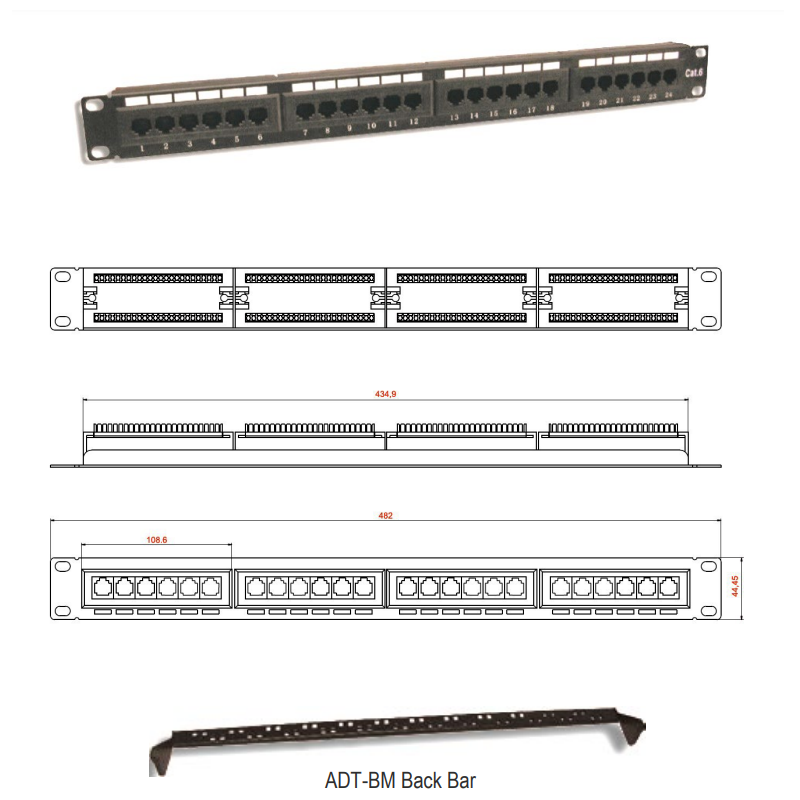 19” unshielded Cat. 6 patch panel, 24 ports, punch-down style, dual IDC, 1U |